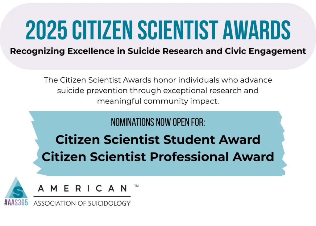 The 2025 Citizen Scientist Award nominations are now open from September 10 – October 15, 2025. These awards honor those who extend their impact beyond formal academic or professional responsibilities to make a meaningful difference in their communities and the broader field of suicide prevention.